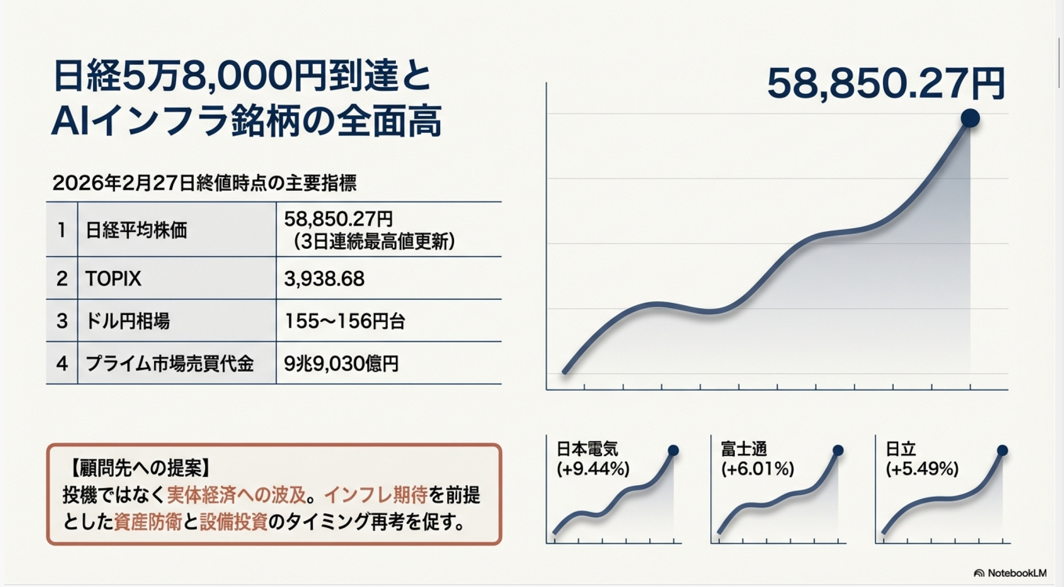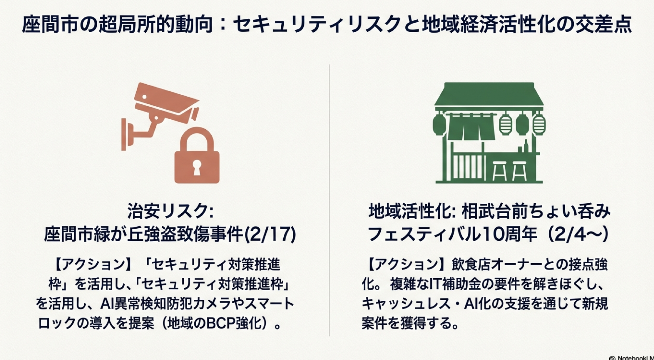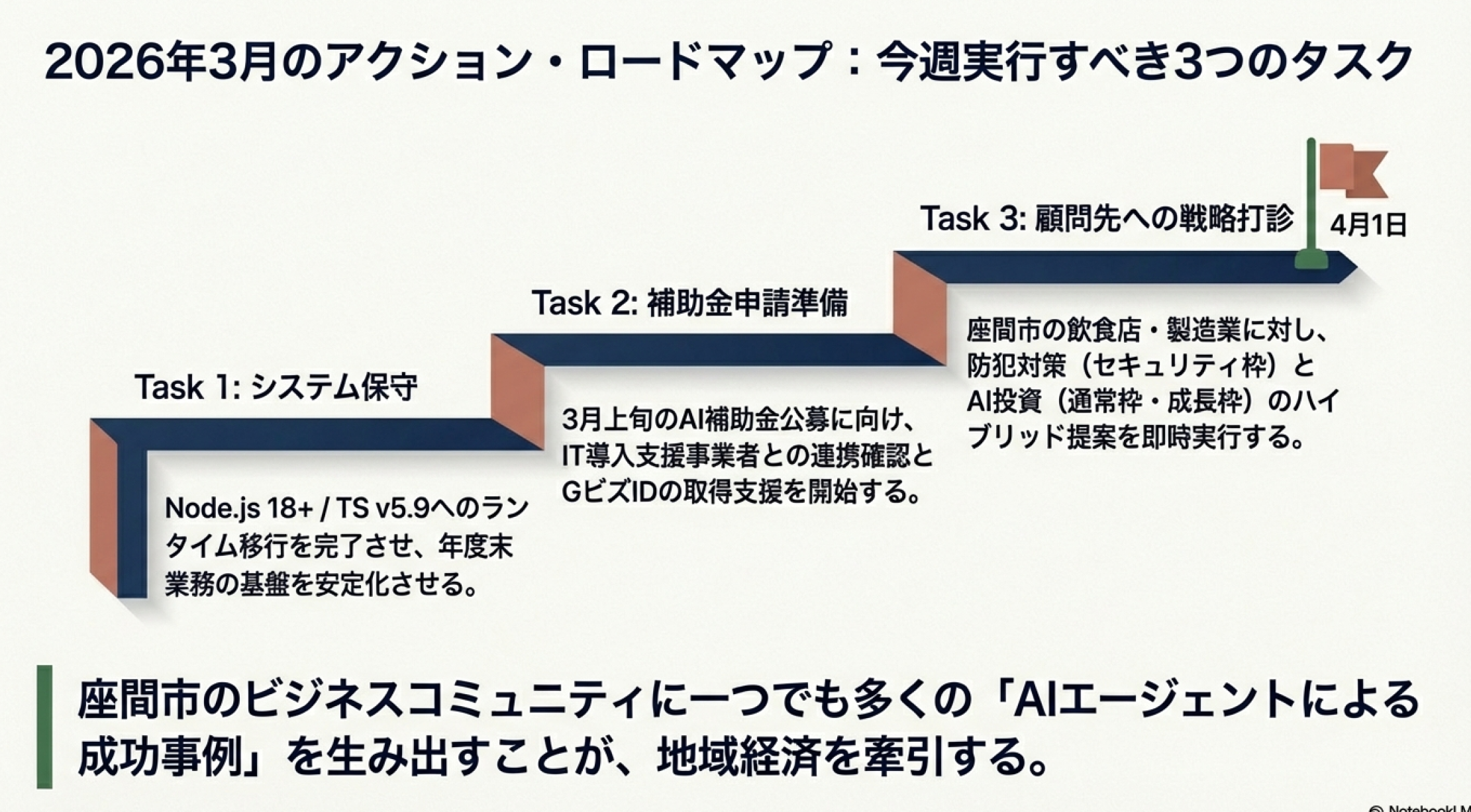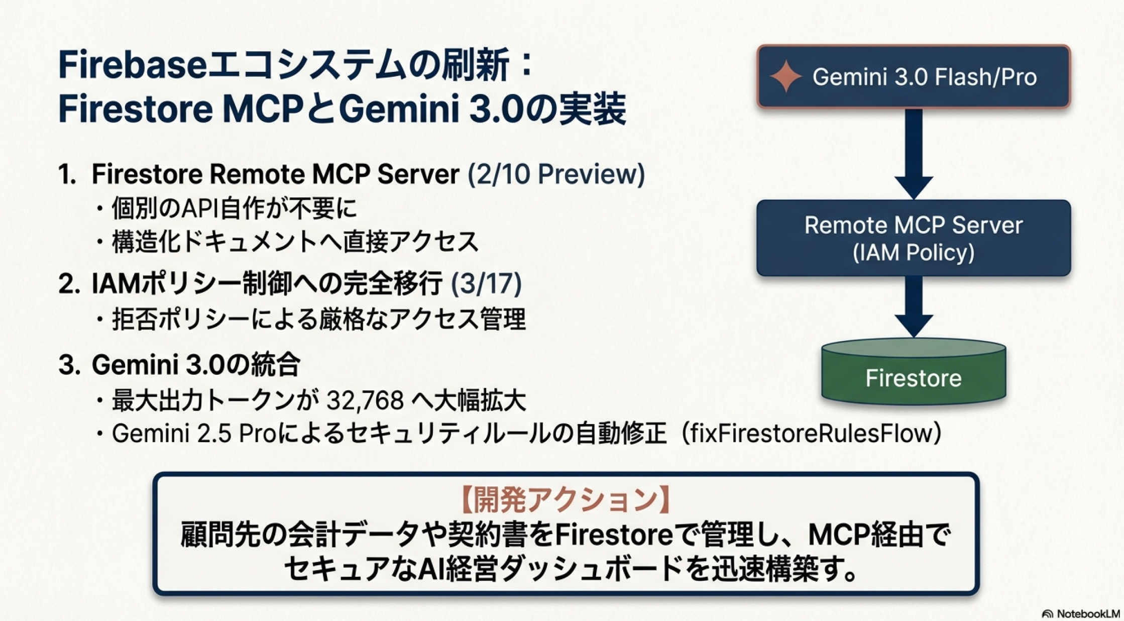 日経平均株価の史上最高値更新や日銀の利上げ観測といったマクロ経済の地殻変動に加え、中小企業のAI導入を支援する新たな補助金制度の詳細がまとめられています。技術面では、AIの相互運用性を高めるModel Context Protocol(MCP)の普及やFirebaseの進化が、実務に与える影響と共に詳述されています。さらに、座間市内の治安情勢や地域イベントにも触れ、地域密着型の専門家が取るべき具体的な経営・開発戦略を提言しています。最終的に、これらの多角的な情報を統合し、最新技術と財務知識を駆使して顧問先の成長を支援する指針を提示する内容となっています。